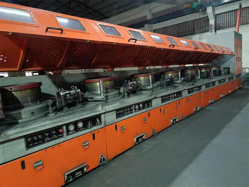 直径5.5mm或6.5mm弹簧钢盘条经砂带机除锈后,通过主动放线架+多道次(8-12)直进辊模拉丝生产线(卷筒560mm、500mm、450mm)+收线机,结构简单紧凑,拉拔速度达10m/s,钢丝圈径良好,强度满足床用弹簧钢丝标准要求,钢丝综合性能比常规拉拔要好,产品合格率达96%以上;滚动摩擦取代滑动摩擦,能耗大幅度降低,初道和最后道次使用拉丝模拉拔,中间道次采用辊模转动挤压,辊模配套油循环冷却,少拉丝粉,现场干净卫生,减碳降耗,保障职工身体健康。